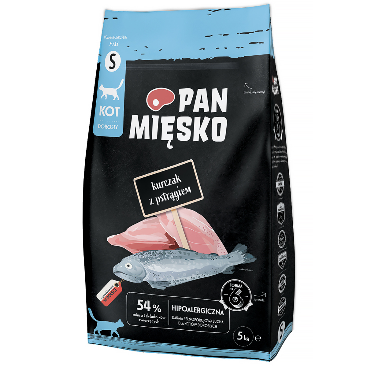 Hipoalergiczna karma dla kotów dorosłych Pan Mięsko kurczak z pstrągiem 5 kg w zestawie z przysmakami.