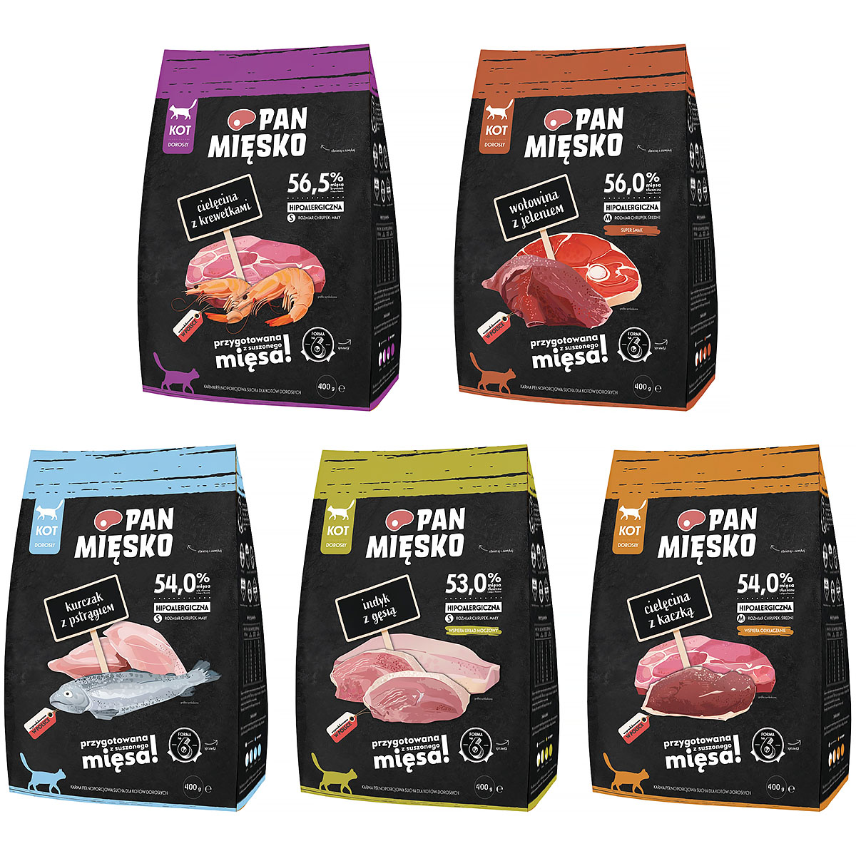 Zestaw suchej karmy dla kota Pan Mięsko w opakowaniach 400 g. Karma dla kota jest hipoalergiczna, dlatego doskonale sprawdza się dla kotów z różengo rodzaju alergiami. Skład karmy opracowany został w sposób, który poztywnie wpływa na zdrowie i kondycję kotów.