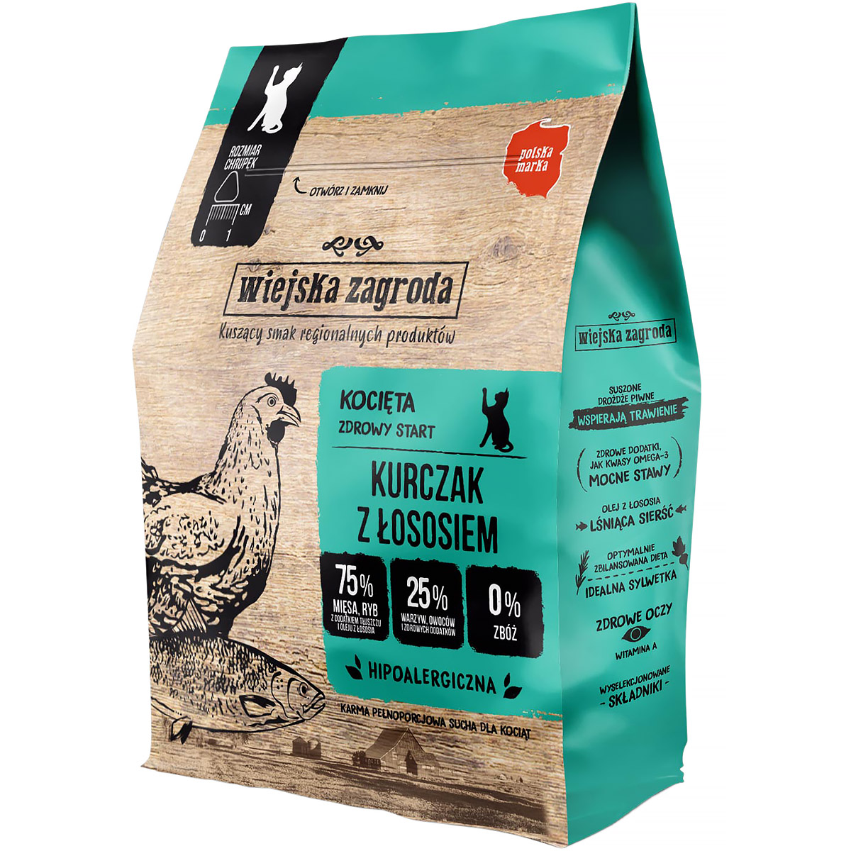 Co charakteryzuje suchą karmę dla kociąt Wiejska Zagroda z kurczakiem i łososiem?