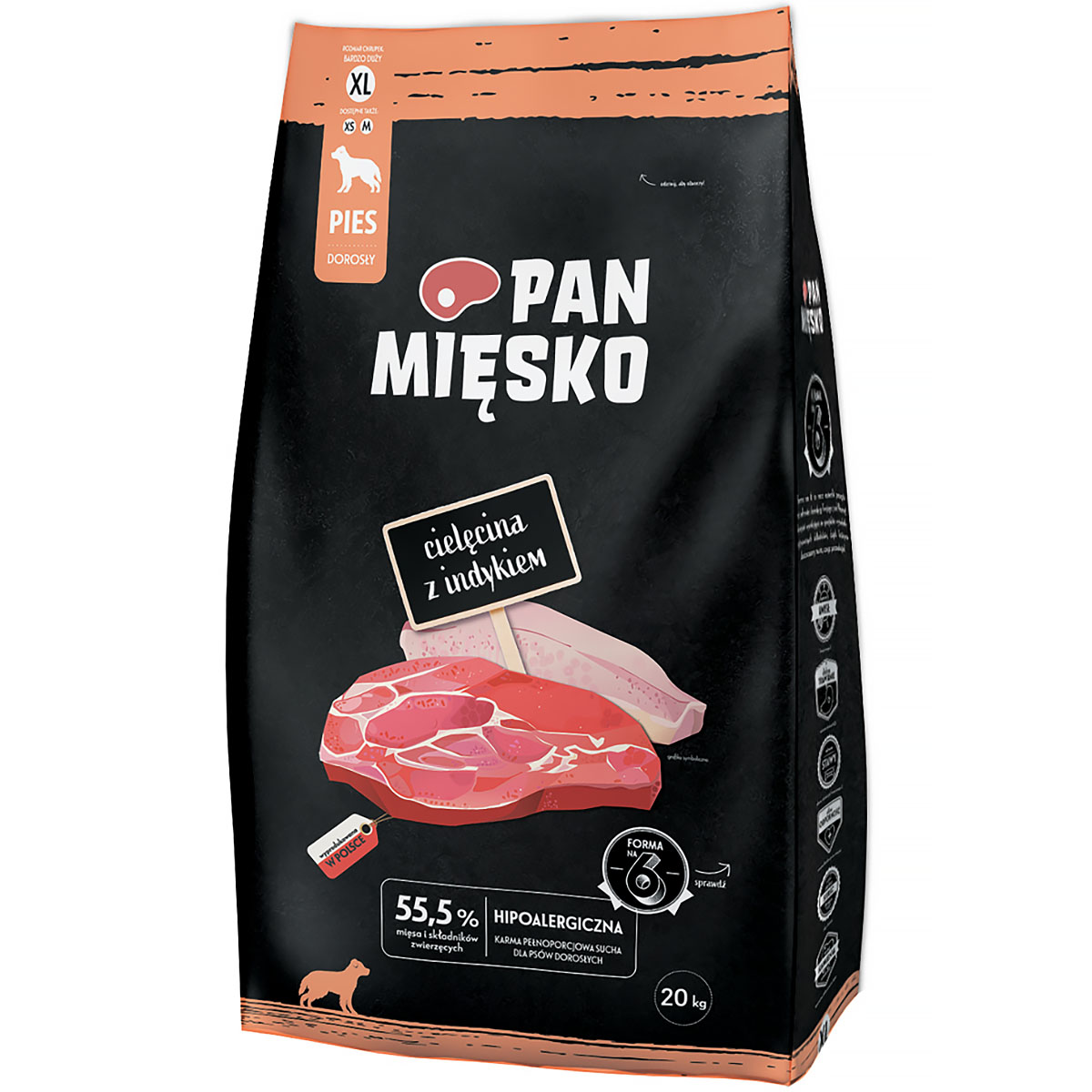 Sucha karma dla psa Pan Mięsko bogata w cielęcinę i mięso z indyka to pełnoporcjowy pokarm dla dorosłych psów średnich ras. Hipoalergiczna karma dla psów Pan Mięsko 9 kg została wytworzona z wyselekcjonowanych gatunków mięs, a jej receptura opracowana przez specjalistów żywienia zwierząt. Dzięki temu karma jest lekkostrawna, pełna wartości odżywczych i w dodatku nie uczula czworonogów.