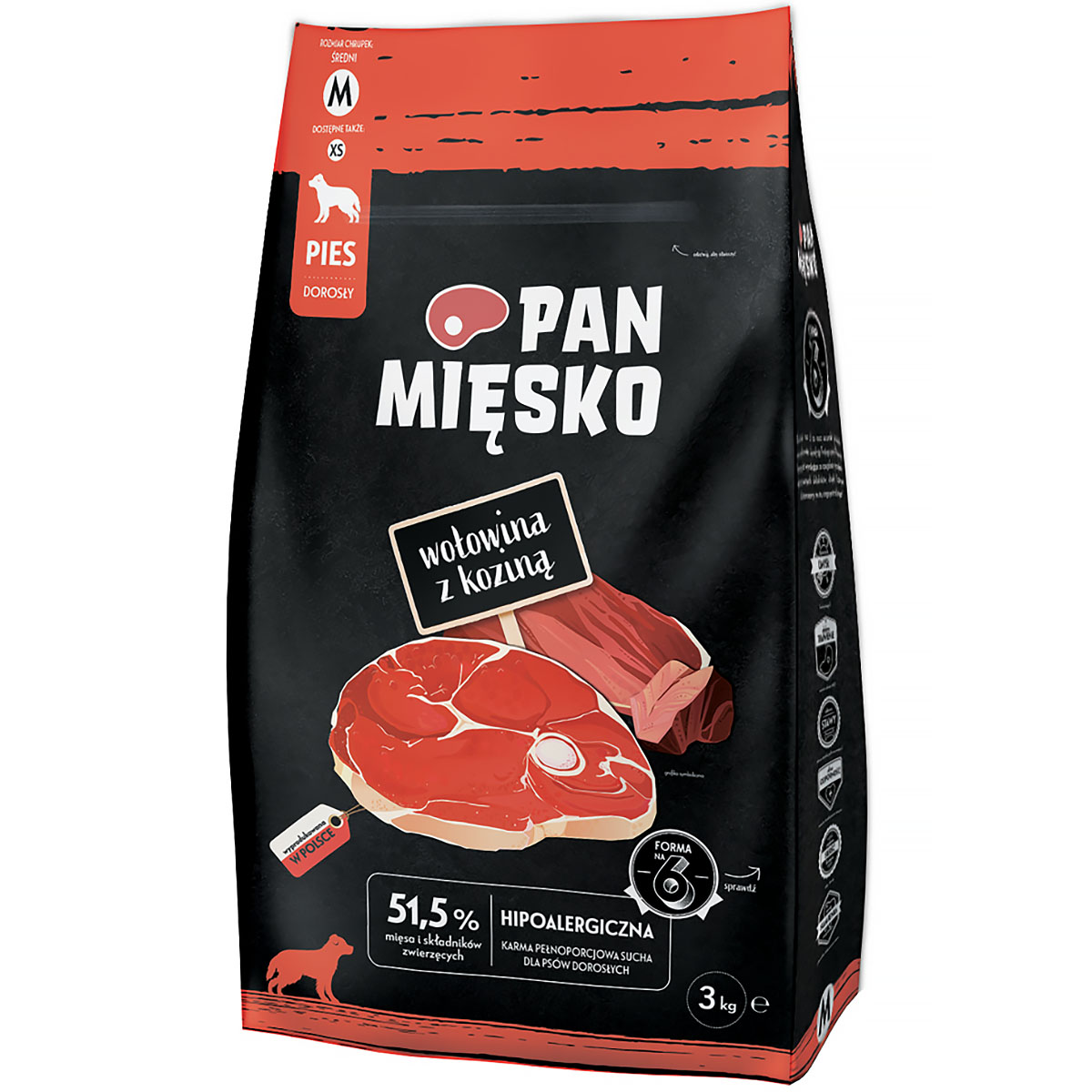 Sucha karma dla psa Pan Mięsko wołowina z koziną M 3 kg dorosłe psy to doskonale zbilansowana i pełnowartościowa karma wyprodukowana głownie z wołowiny i koziny z dodatkiem apetycznych i zdrowych warzyw, owoców i składników odżywczych wspomagających prawidłowe funkcjonowanie całego organizmu twojego psa.
