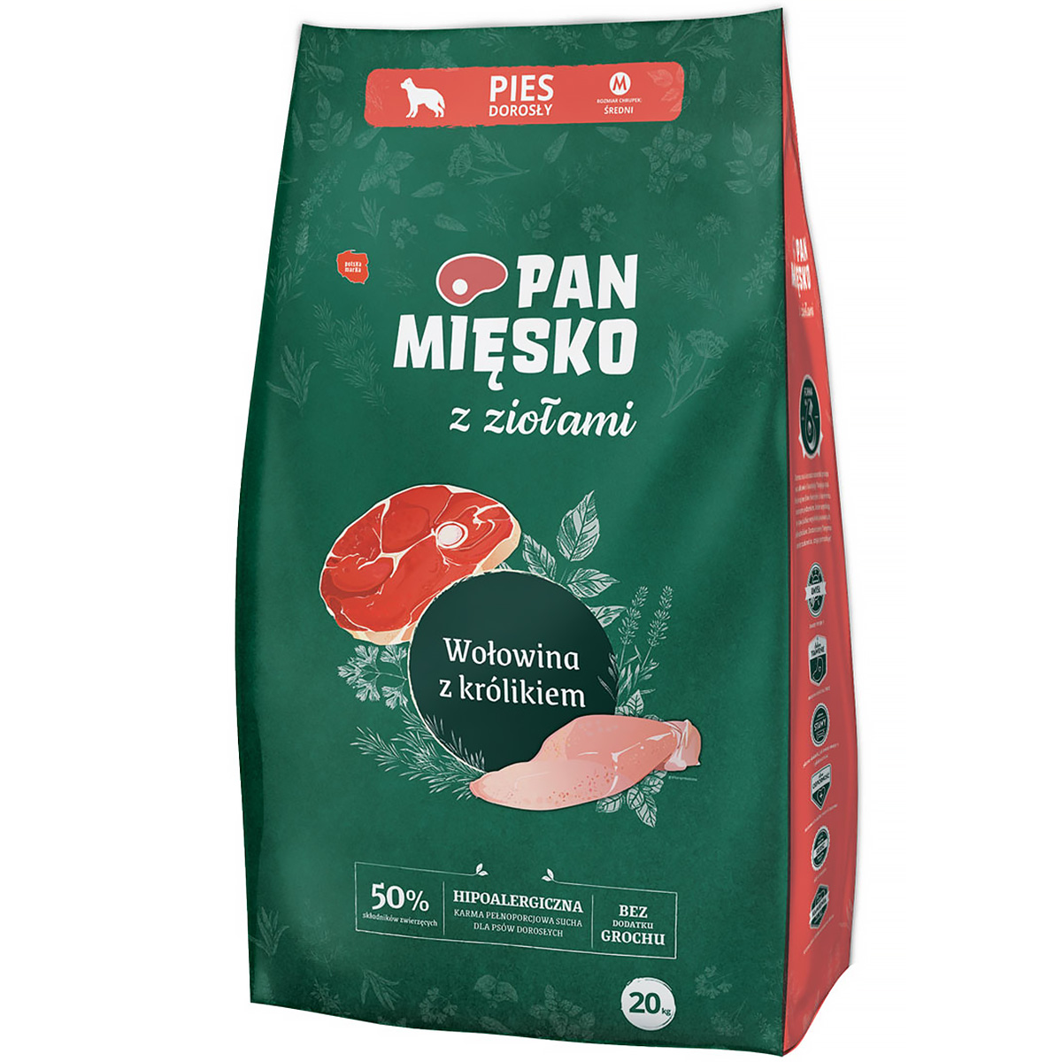 Sucha karma dla psa Pan Mięsko z Ziołami wołowina z królikiem hipoalergiczna M 20 kg dorosłe psy to pełnowartościowa sucha karma dla dorosłych psów ras średnich o smaku wołowiny z królikiem. To hipoalergiczna formuła, która charakteryzuje się nie tylko wielkością chrupek w rozmiarze M, ale również sporą wagą, aż 20 kg, stworzona z myślą o psach wymagających szczególnej troski i wysokiej jakości żywienia.