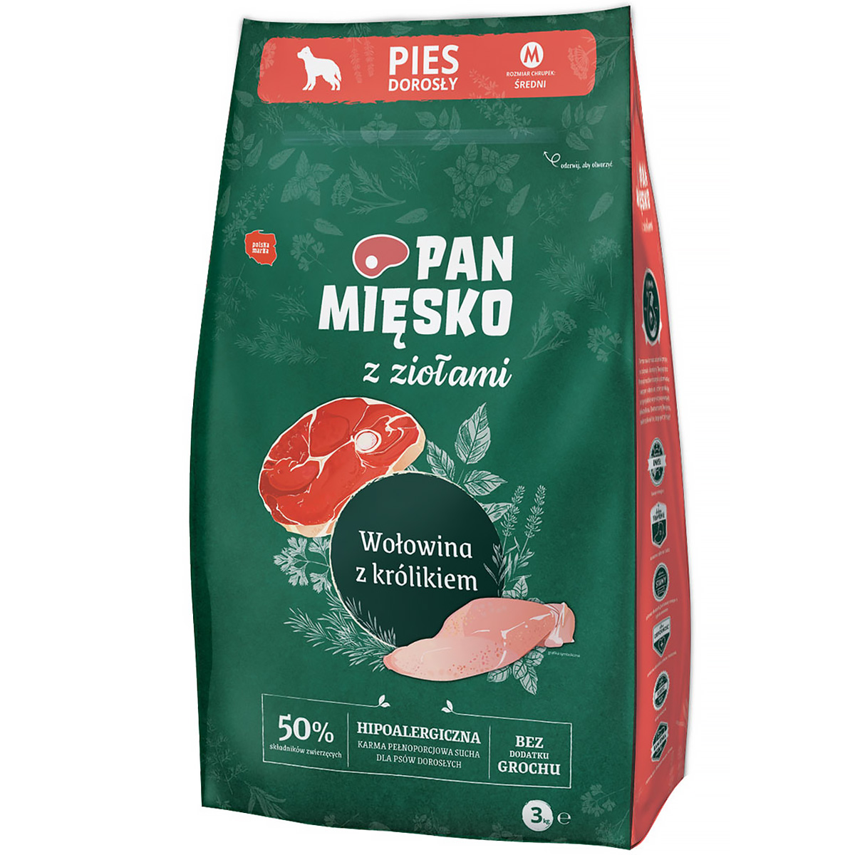 Pan Mięsko z Ziołami to wyjątkowa sucha karma dedykowana dorosłym psom, dostępna w praktycznym opakowaniu o wadze 3 kg. Ta hipoalergiczna karma to doskonałe połączenie smaku i zdrowia, stworzone z myślą o zapewnieniu kompleksowego wsparcia żywieniowego dla psów dorosłych. Smak wołowiny z królikiem z pewnością sprosta oczekiwaniom najbardziej wymagających podniebień.