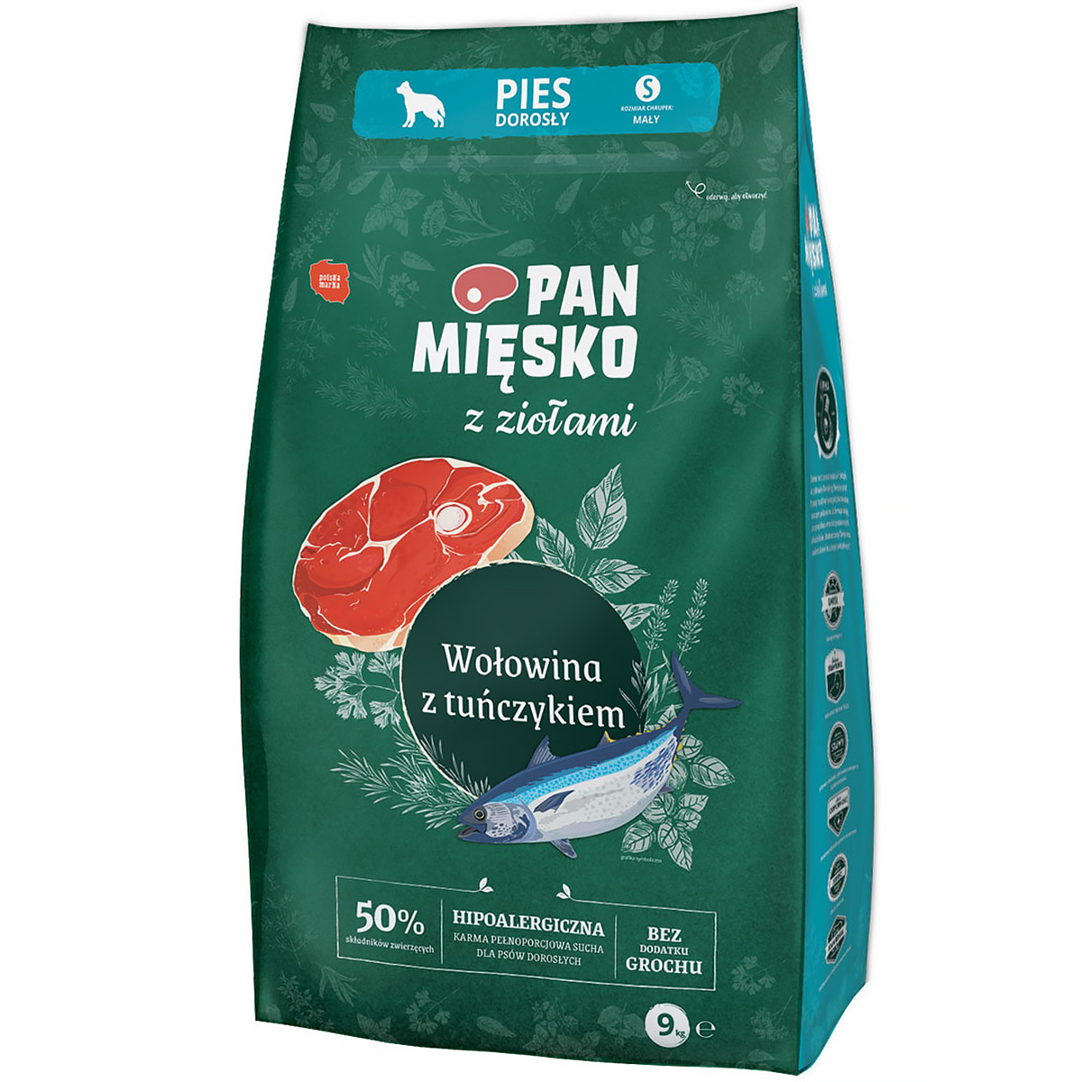 Sucha karma dla psa Pan Mięsko z Ziołami wołowina z tuńczykiem S 9 kg dorosłe psy to wyjątkowa sucha karma dla dorosłych psów, dostępna w ekonomicznym opakowaniu o wadze 9 kg. Pan Mięsko to pełnoporcjowa karma, która została stworzona z myślą o zapewnieniu kompleksowego wsparcia żywieniowego dla psów dorosłych, a smak wołowiny z tuńczykiem z pewnością spełni oczekiwania nawet najbardziej wymagających podniebień.