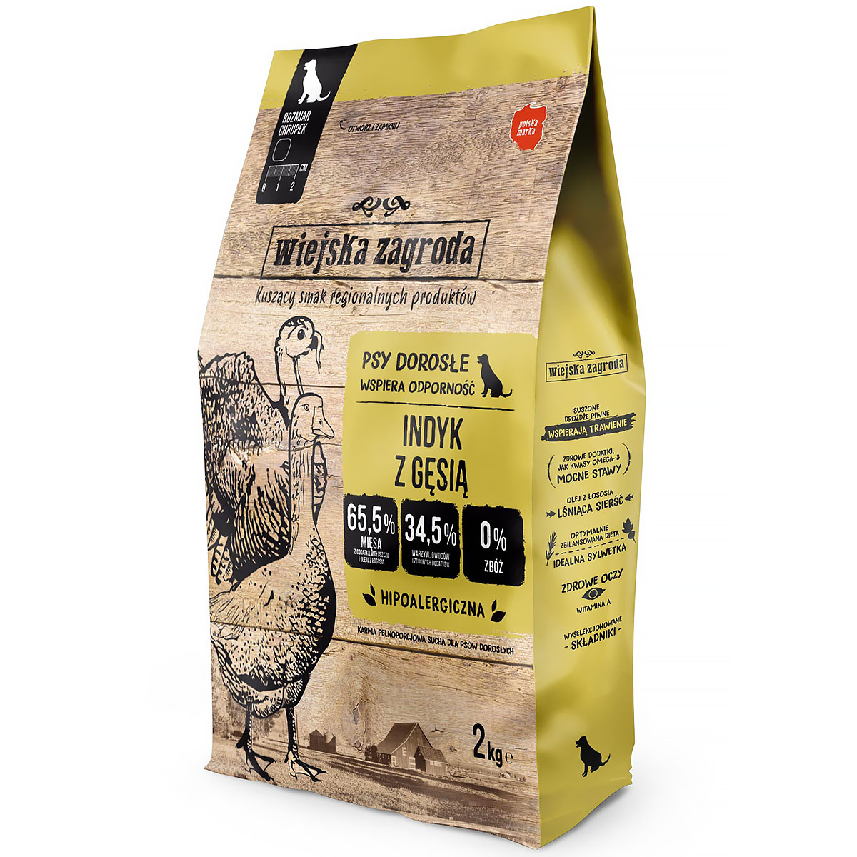 Sucha karma dla psa Wiejska Zagroda indyk z gęsią M 2 kg dorosłe psy to pełnowartościowa sucha karma dla dorosłych psów, która dostarcza naszym pupilom nie tylko energii, ale również wszystkich niezbędnych składników odżywczych. Dość duży rozmiar chrupek - Medium sprawia, że pokarm ten idealnie nadaje się dla dużych psów, które pragną przeżyć wyjątkową podróż kulinarną.