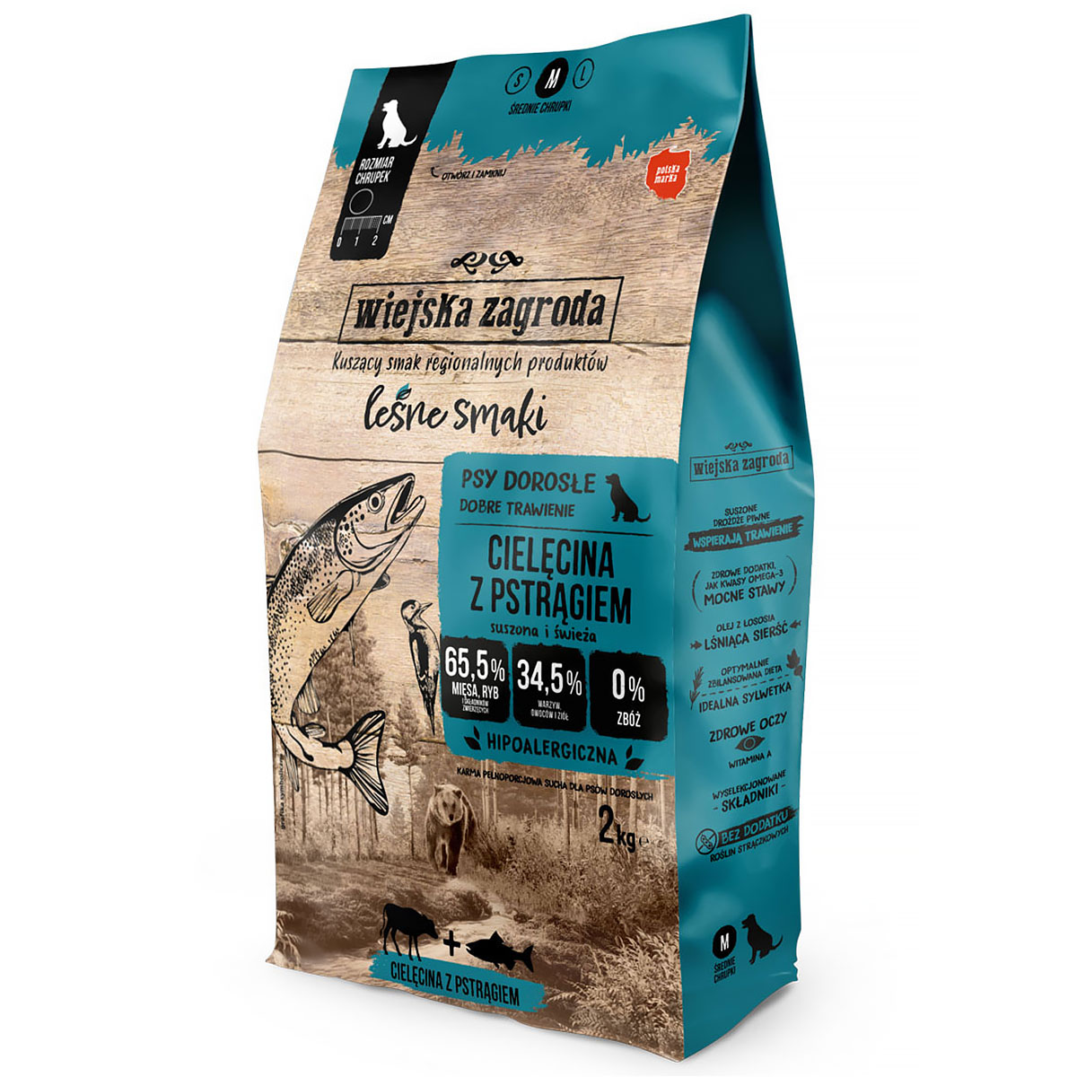 Sucha karma dla psa Wiejska Zagroda leśne smaki cielęcina z pstrągiem M 2 kg dorosłe psy to wyjątkowa, zdrowa i smaczna karma dla twojego pupila. Suchy posiłek dla psa to polska karma, która cechuje się starannie dobranymi składnikami pochodzącymi z dobrych i polskich źródeł. Doskonałe połączenie mięsa cielęcego i pstrąga zachęci do skosztowania każdego czworonoga.