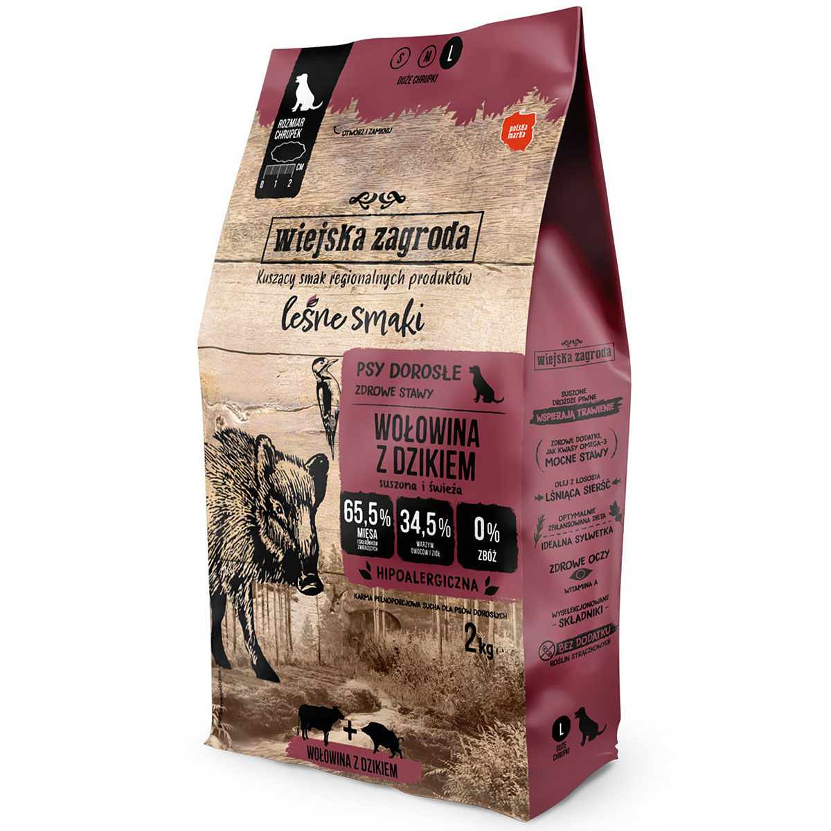 Sucha karma dla psa Wiejska Zagroda leśne smaki wołowina z dzikiem L 2 kg dorosłe psy to doskonały i pełnowartościowy posiłek, który dostarcza naszemu pupilowi wszystkich składników odżywczych i witamin, których potrzebuje. Dzięki doskonałemu połączeniu wołowiny i dzika pokarm dostarcza naszemu czworonogowi niezwykłych doznań smakowych oraz niesamowitej zabawy. Duży rozmiar chrupek - Large idealnie sprawdza się jako posiłek dla dużych, dorosłych psów.