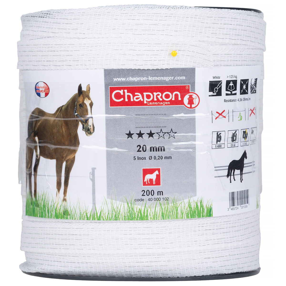 Taśma elektrycznego pastucha jest bardzo odporna na naprężanie oraz naciąganie. Odporność na zerwanie wynosi ok.125kg. Szpula zawiera 200m taśmy o szerokości 20mm. W taśmę wplecionych zostało 5 drucików ze stali nierdzewnej o średnicy ok.0,2mm, co pozwala na doskonałe przewodzenie impulsów elektrycznych - oporność wynosi 4,56 Ohm/m.W przypadku zapotrzebowania na taśmy do dłuższych lub krótszych ogrodzeń lub innych zwierząt polecamy pozostałe rodzaje