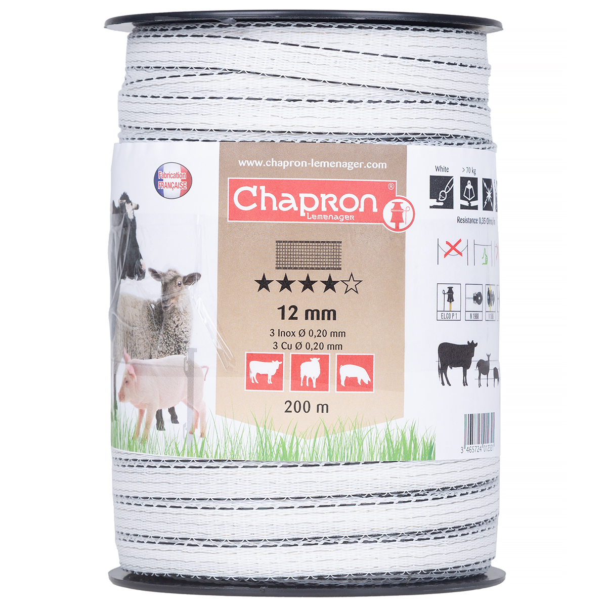 Wysokiej jakości mocna taśma do pastucha elektrycznego wykonana z włókien polipropylenowych, odpornych na warunki atmosferyczne, takie jak m.in. promieniowanie UV, niskie/wysokie temperatury, opady. Taśma do ogrodzeń elektrycznych z uwagi na biało - czarny kolor oraz szerokość 12 mm jet dobrze rozpoznawalna nawet z większych odległości. Niniejsza taśma do pastucha często wykorzystywana jest do wygrodzenia wybiegu dla koni czy do ochrony pól przeciw dzikiej zwierzynie leśnej, np. sarnom.