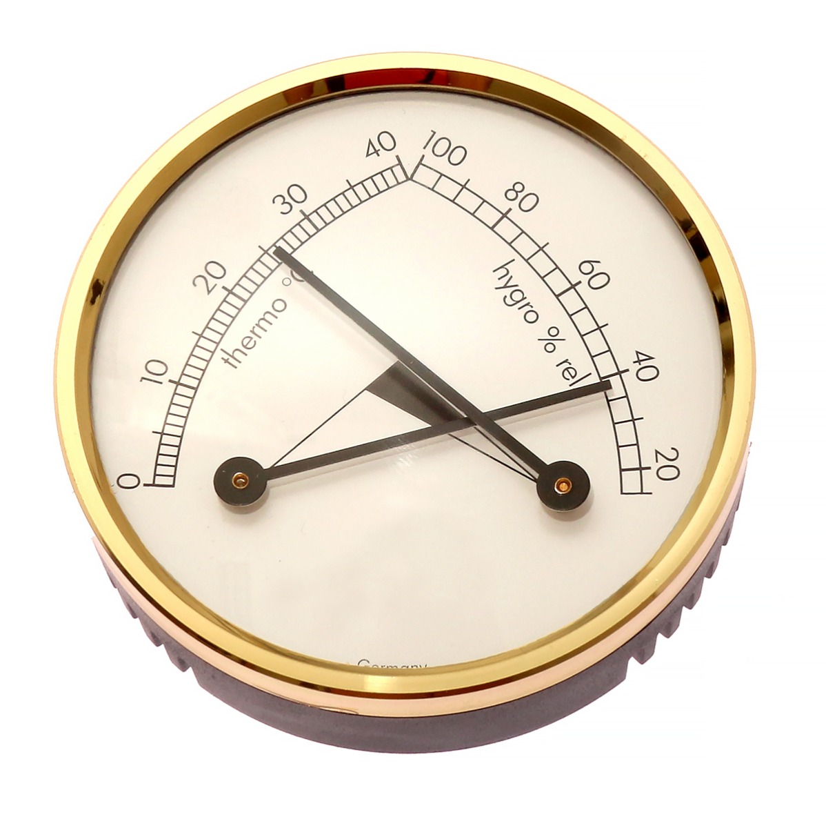 Niezawodny wskaźnik do pomiaru temperatury i wilgotności powietrza. Termohigrometr zbudowany jest z tarczy zegarowej i dwóch oddzielnych wskaźników, które informują o bieżącej temperaturze i wilgotności powietrza.