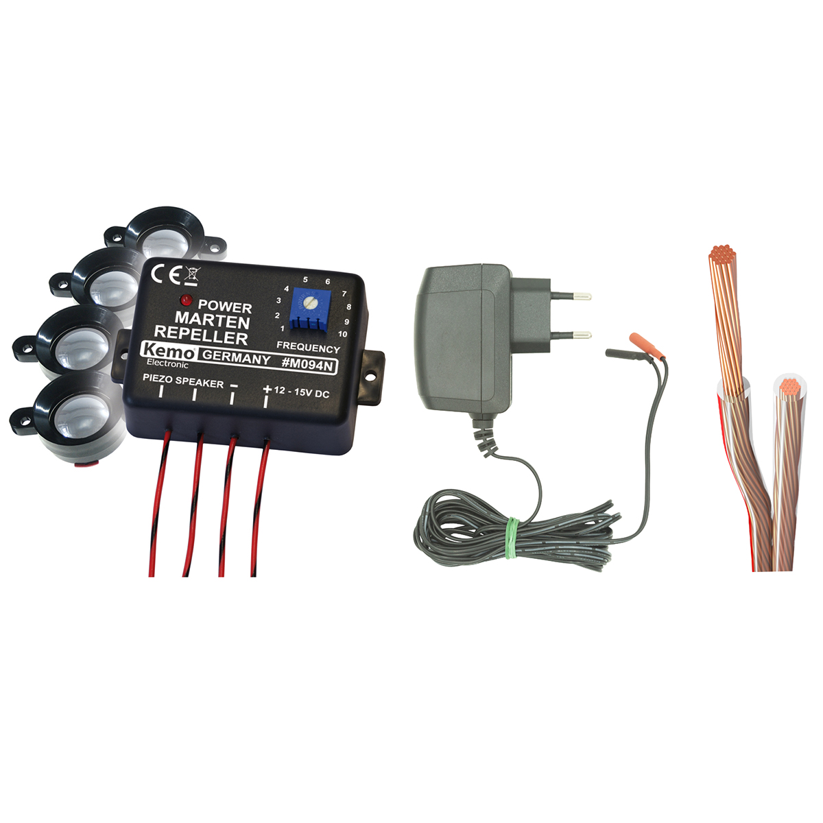 odstraszacza kun ptaków i gryzoni, w skład którego wchodzą: urządzenie ultradźwiękowe wraz z 4 głośnikami, zasilacz oraz 20 metrów przewodu dwużyłowego. Zestaw