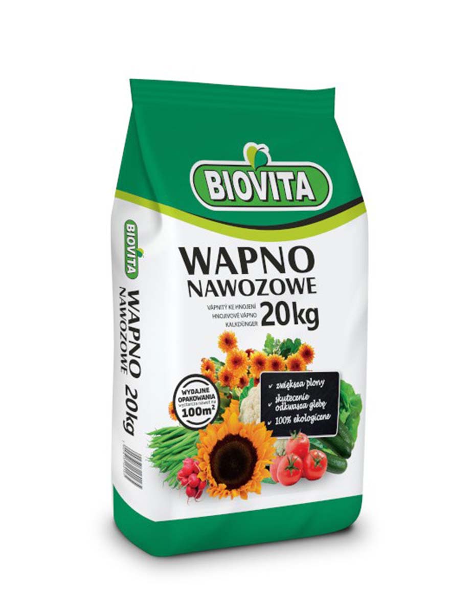 Wapno nawozowe BIOVITA 20 kg w formie proszku, to preparat polecania do nawożenia oraz do odkwaszania ziemi. Wapno nawozowe z magnesem znajdzie zastosowanie dla ziemi przygotowanej pod rośliny, które lubią stanowisko zasadowe. Wapno nawozowe może być stosowane: