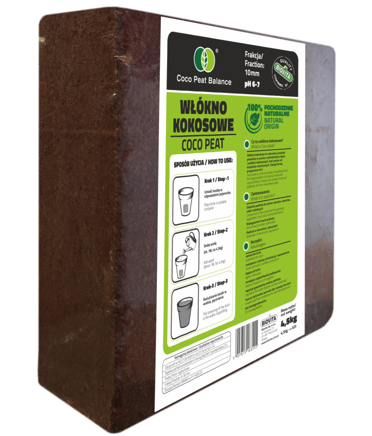 Sposób użycia: Kostkę włókna kokosowego umieścić w pojemniku, następnie dodać wodę i poczekać aż podłoże napęcznieje.